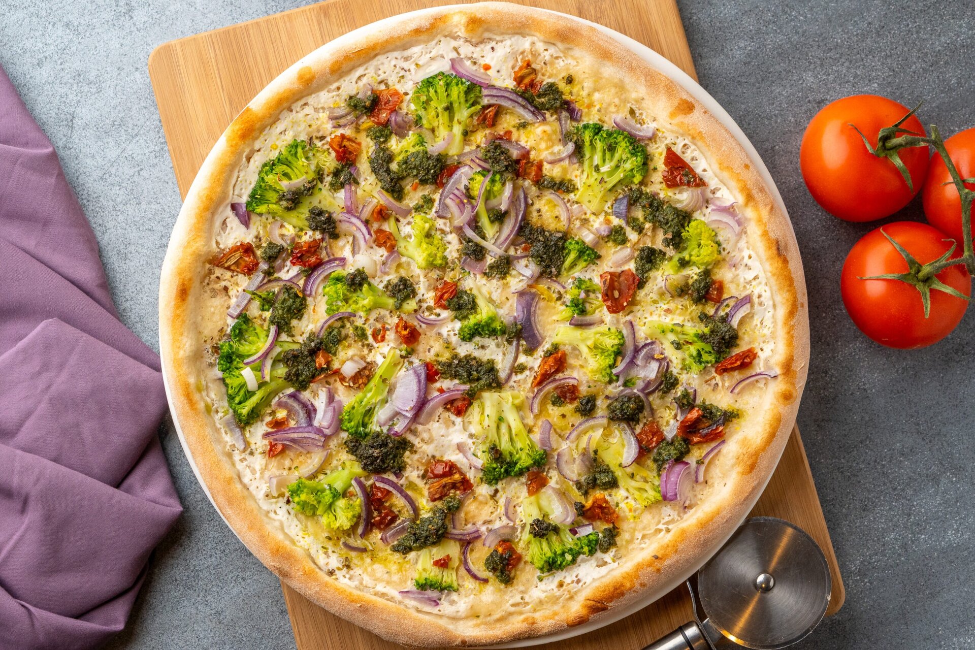 • Nefelejcs Pizza – fokhagymás szójajoghurt alap, brokkoli, aszalt paradicsom, bazsalikompesztó, rukkola, kesuparmezán
